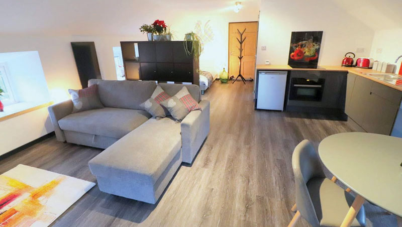 Now they have expanded operations into two outbuildings – establishing a self-contained, self-catering apartment in a former hay loft … and a music studio/rehearsal space in the old cow shed.