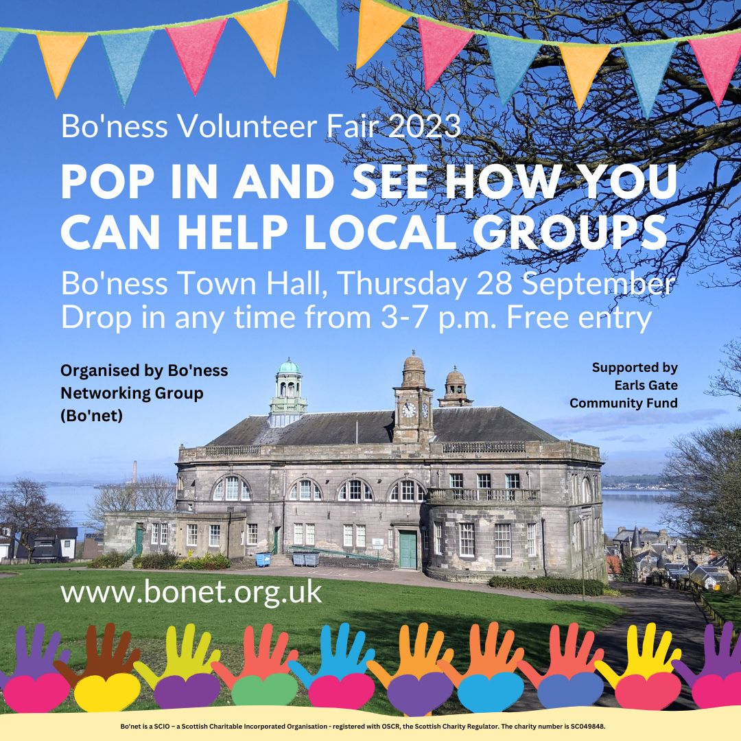 The Volunteer Fair is being held in Bo’ness Town Hall, Glebe Park, Stewart Ave, Bo’ness EH51 9NJ