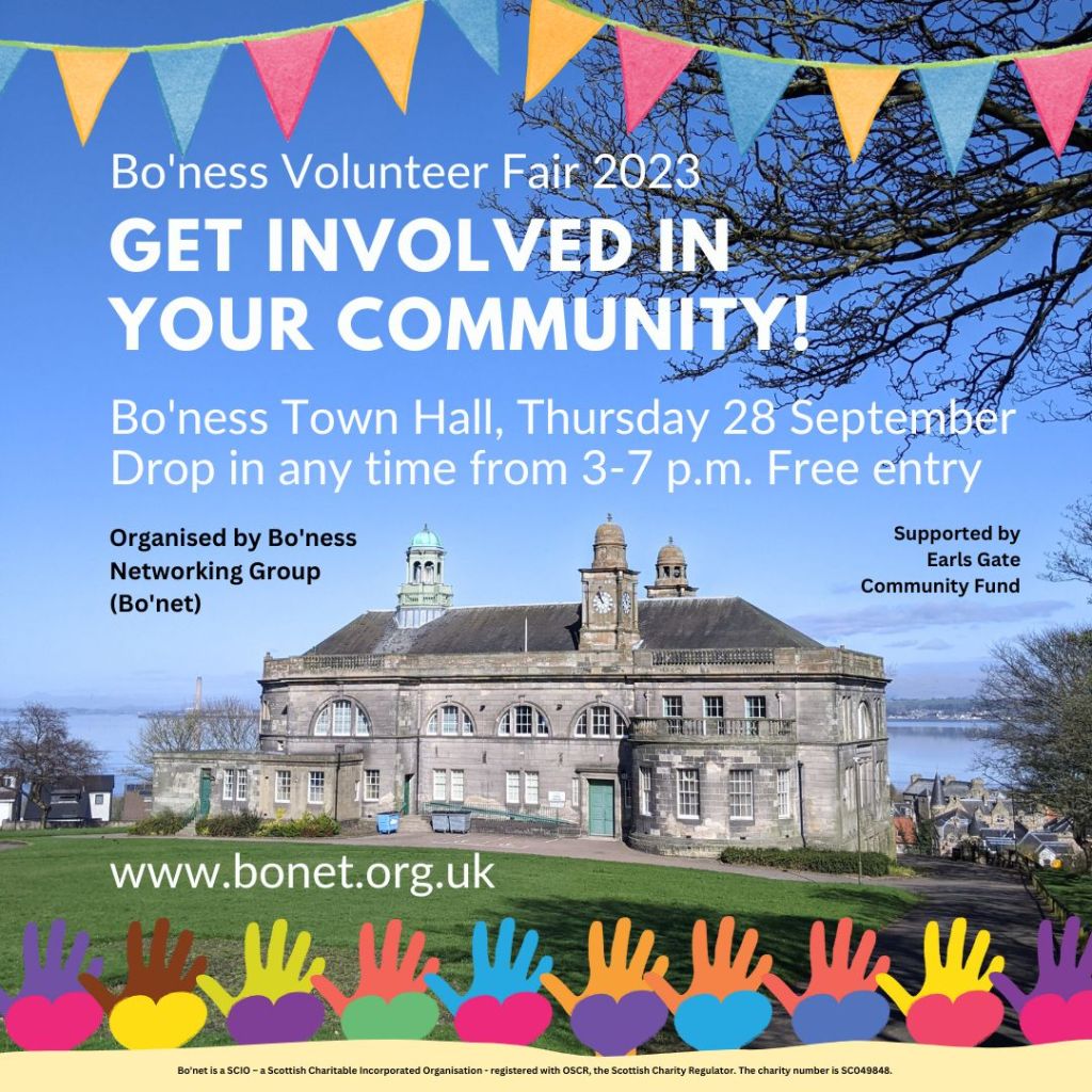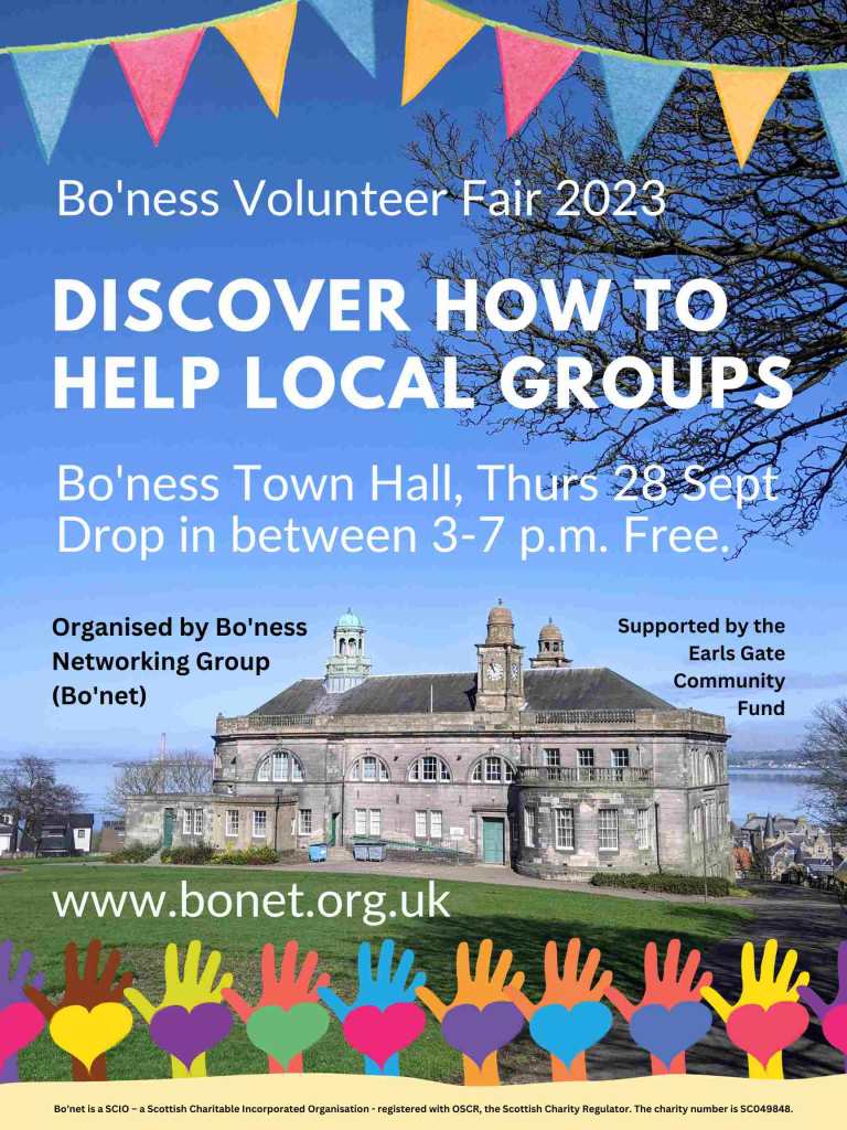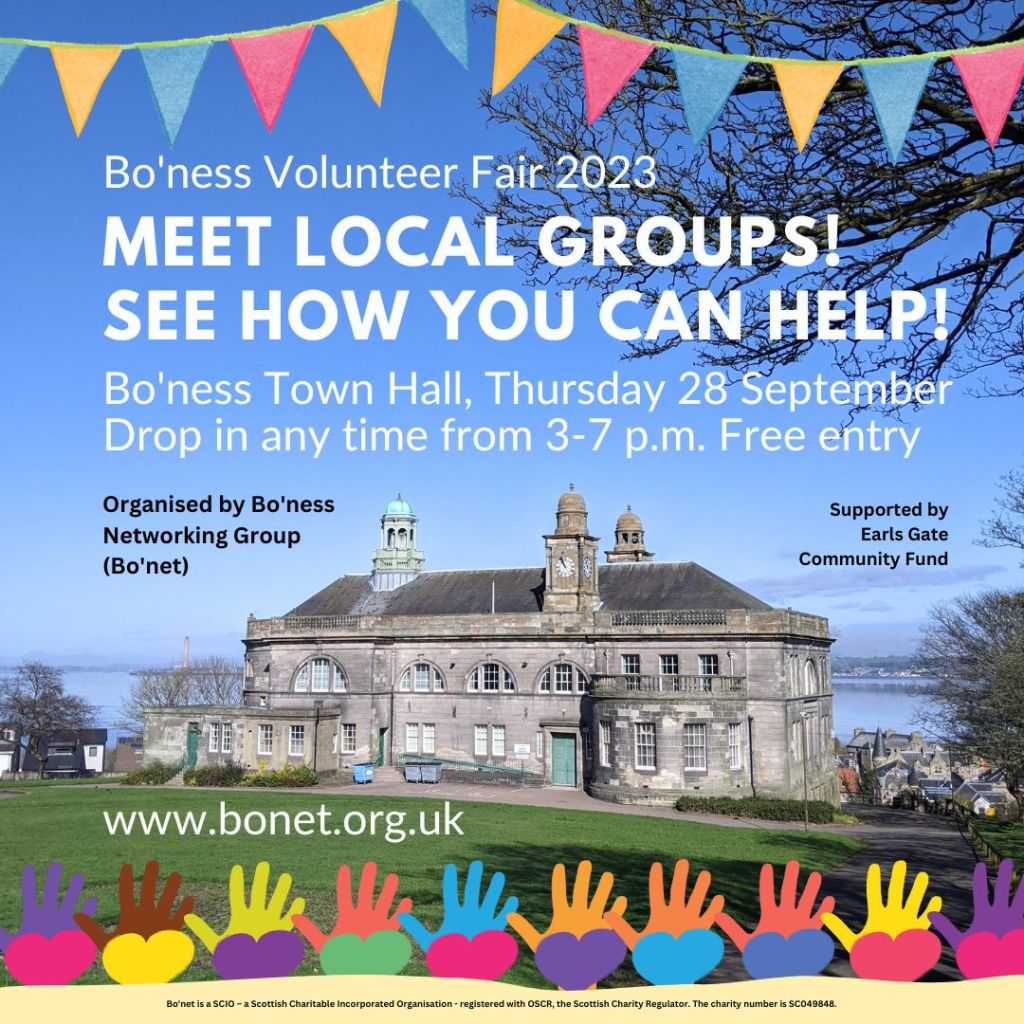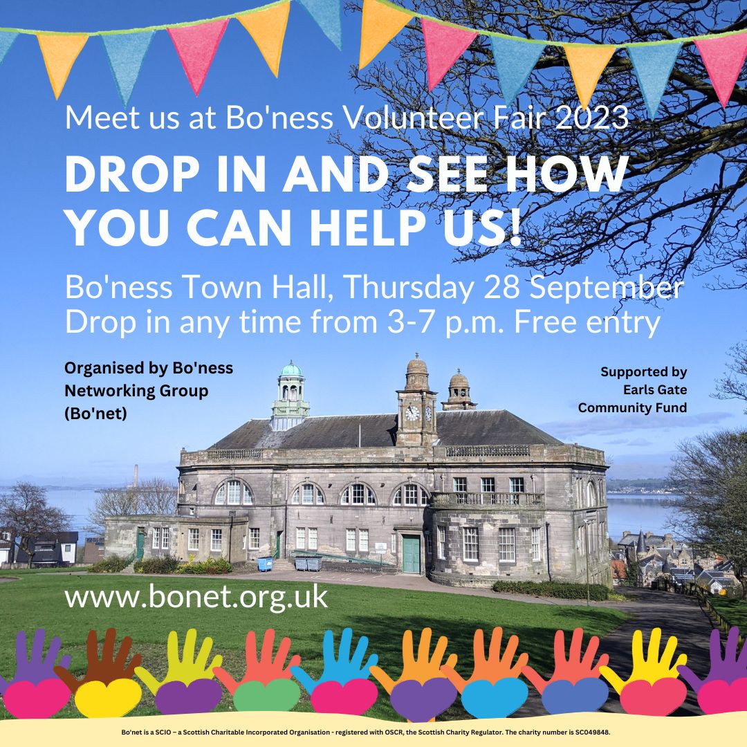 We’re at the Bo’ness Volunteer Fair in Bo’ness Town Hall on Thursday 28 September. Drop in any time between 3 and 7 p.m. and discover our work – and how you can help! More at http://www.bonet.org.uk #BonessVolunteerFair