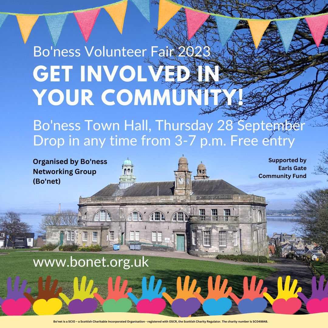 Come along and meet us at the Bo’ness Volunteer Fair at Bo’ness Town Hall on Thursday 28 September. Drop in any time between 3 and 7 p.m. and find out more. More at http://www.bonet.org.uk #BonessVolunteerFair